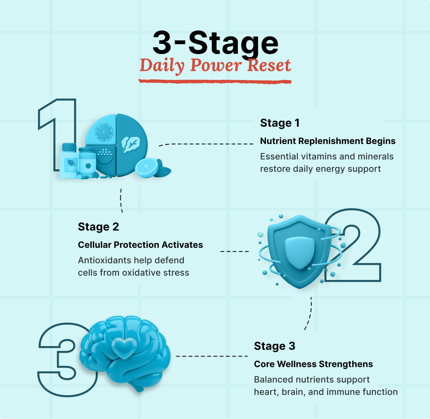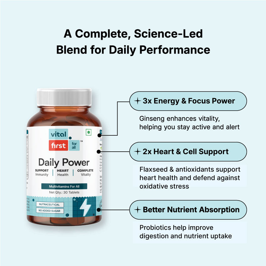 Daily Power is your all-in-one multivitamin designed to fuel daily activity, strengthen immunity, and support heart and metabolic health. Formulated with essential vitamins, minerals, and natural extracts, it keeps your body energized, balanced, and protected every day.