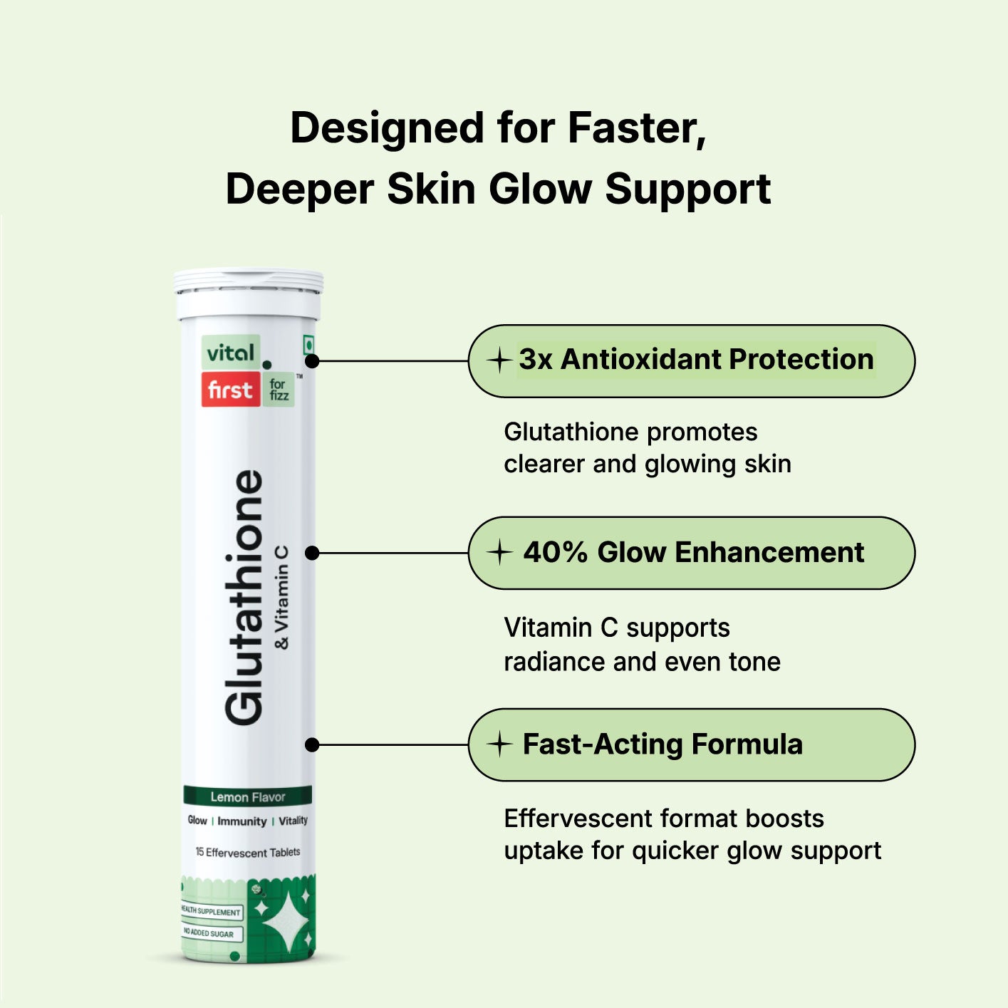 Glutathione + Vitamin C is a refreshing lemon-flavored effervescent that combines two powerful antioxidants to brighten, protect, and energize from within.